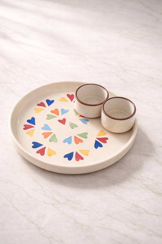 Studio Pottery Hand-Painted Snack Plate 9 inch with Dip Bowls